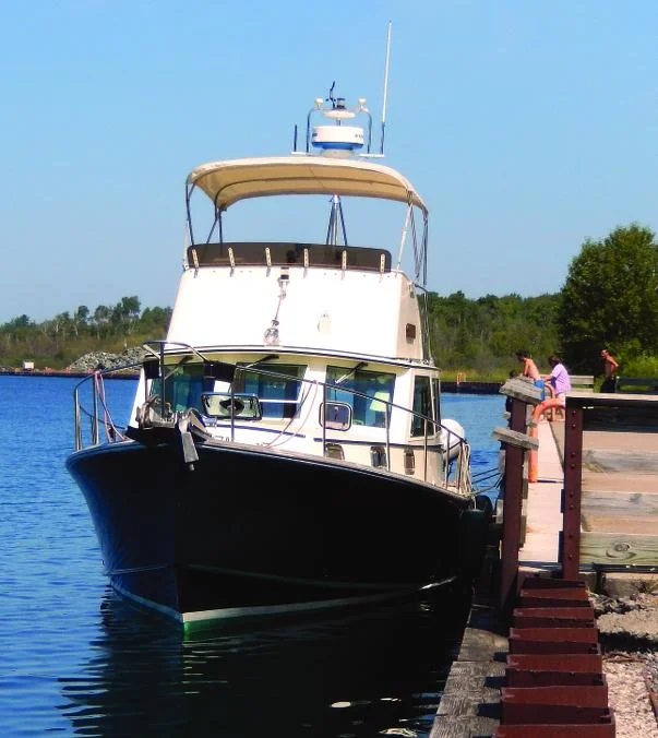 We had been able to truck the Dyer 29 to Lake Superior. However, Windrush was too big to fit under bridges, so we had the pleasure of driving her back on her own bottom. We went up the Chesapeake, down the Delaware, up the Atlantic coast to New York City, then up the Hudson River and along the Erie Canal (the Great Loop so far). Then we veered right to Lake Ontario, went through the Trent-Severn Canal and over the Big Chute, splashed into Georgian Bay, and finally cruised up the St. Mary’s River into Lake Superior and across the lake to Madeline Island, Wisconsin, our homeport. The trip was 1,500 horizontal miles and 601 vertical feet through 76 locks; during that long shakedown cruise we went through a dozen fuel filters (bad supplies maybe?), but did not need to add a drop of oil to the Yanmar.